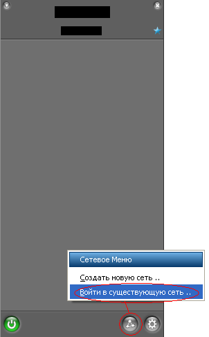Внизу серого окна есть 3 кнопки: Кнопка Включения, Нужная нам кнопка(В виде аналогичной пирамидки), Кнопка Настройки. Нажимаем на кнопку в виде уже знакомой нам пирамидки и выбираем "Войти в уже существующую сеть".